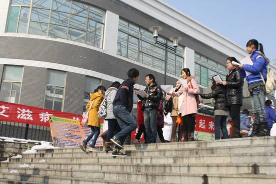 此次活动得到了同学们的热情关注,很多同学自愿加入到活动中来。在凛冽的寒风中,他们胸戴医疗服务中心医护人员精心制作的“红丝带”,传递着尊重生命、关注健康、消除艾滋病歧视的美好心愿。