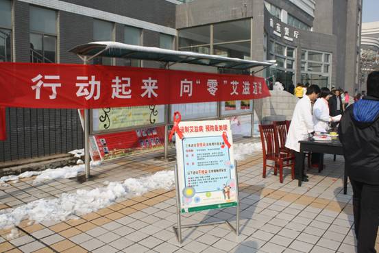 在活动现场,醒目地悬挂着2011年我国艾滋病的宣传主题横幅:“积极行动,向‘零’艾滋迈进”。另外,还精心制作了“预防艾滋病你我共参与”的宣传标语、艾滋病预防知识展板、艾滋病宣传健康教育处方等等。参加宣传活动的人员一边发放着艾滋病宣传资料,一边向同学们讲解艾滋病的发生、发展、危害以及我国艾滋病的防治政策。