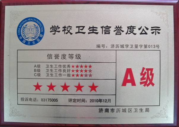 近年来,我院卫生工作在学院领导高度重视下,严格执行政策法规,健全管理机制,不断加大卫生基础设施投入,全员卫生意识、监督意识、参与意识不断增强,卫生面貌得到了进一步改观。在市、区组织的专家组检查、验收中,对我院卫生管理、餐厅与食品卫生管理、水质管理、传染病防治、医疗依法执业管理等工作给予了很高的评价,并授予我院“济南市历城区学校卫生监督量化分级管理A级单位”荣誉称号。