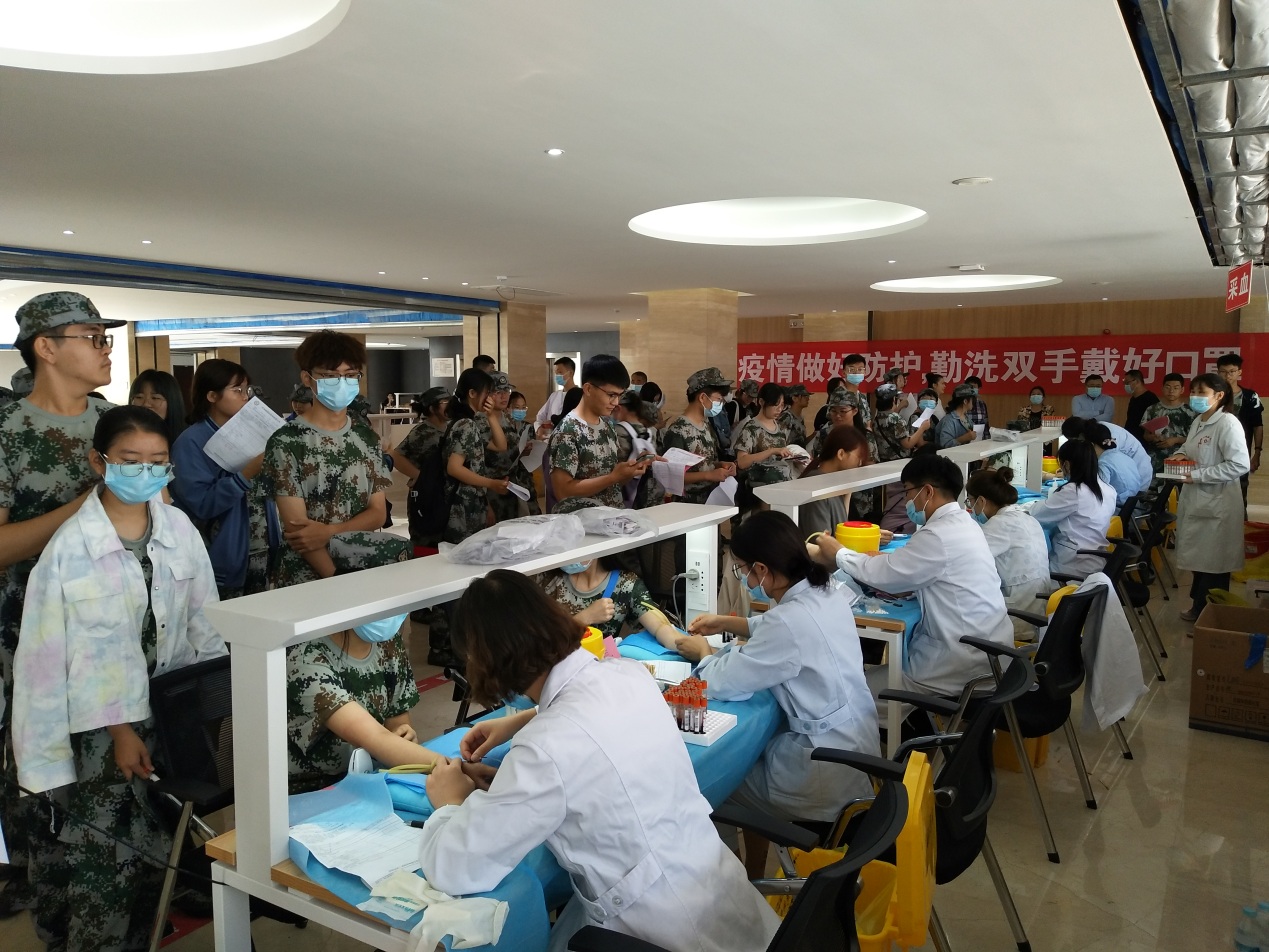 早上6:30分,2021级新生按军训编队的序列,在班级负责人带领下,排队进入躬行楼五层北区东侧体检大厅,领取体检表、填写个人信息,早上7:00,体检正式开始。新生按照体检流程查验健康码、测体温,依次进行一般检查→采血→内、外科检查→测血压→眼科检查→DR胸片→结核菌素试验→交表,完成本次体检。
