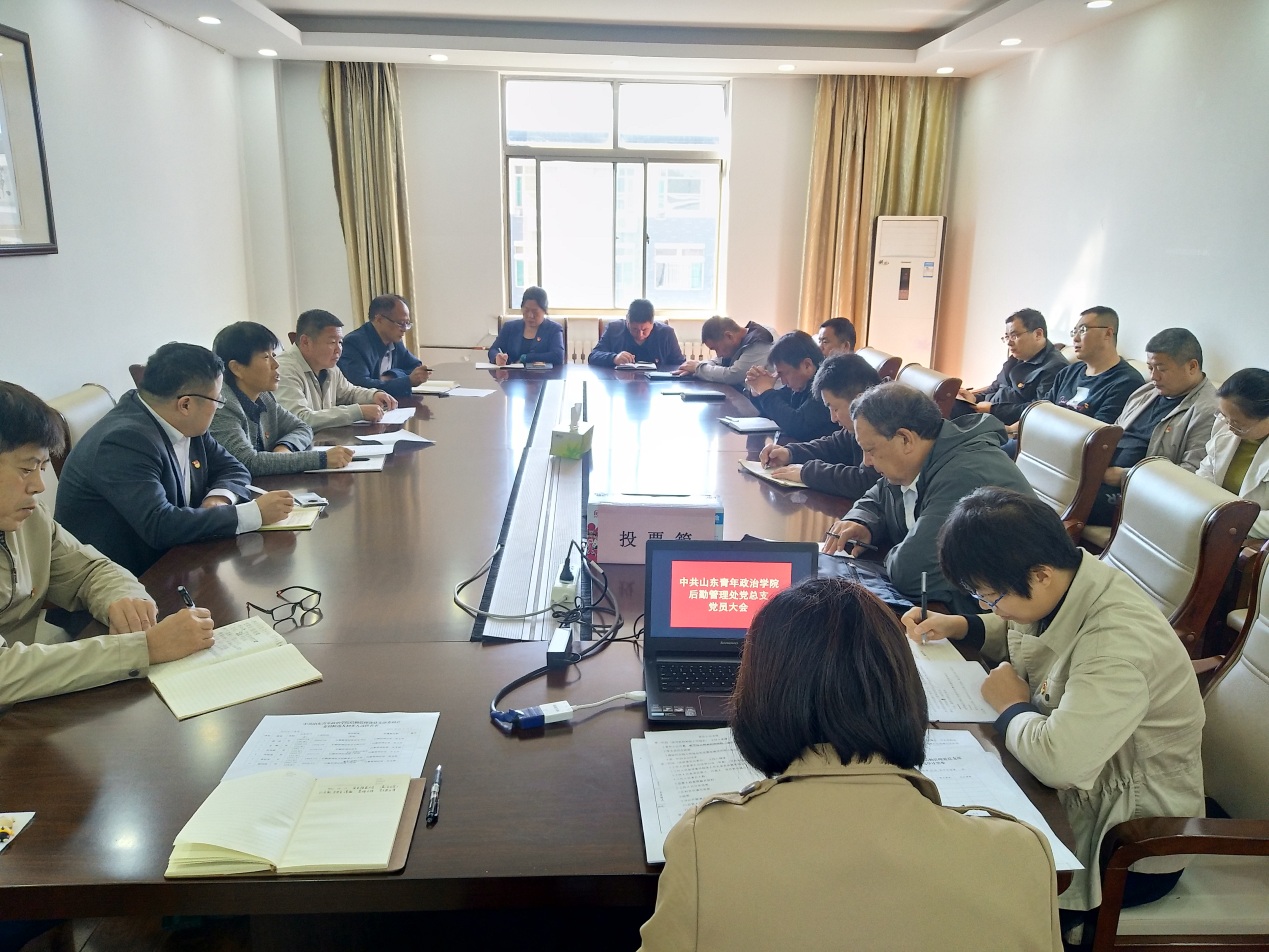 大会分为三个阶段。第一阶段,李玉英同志致辞,党总支书记傅斌代表总支部委员会做工作报告和党费收缴情况报告;第二阶段,工作人员分别宣读大会选举办法、委员候选人名单及基本情况、监票人和计票人,全体党员举手表决通过,随后进行正式选举;第三阶段,监票人报告计票结果,傅斌宣读了中共山东青年政治学院后勤管理处总支部委员会委员当选人员名单。