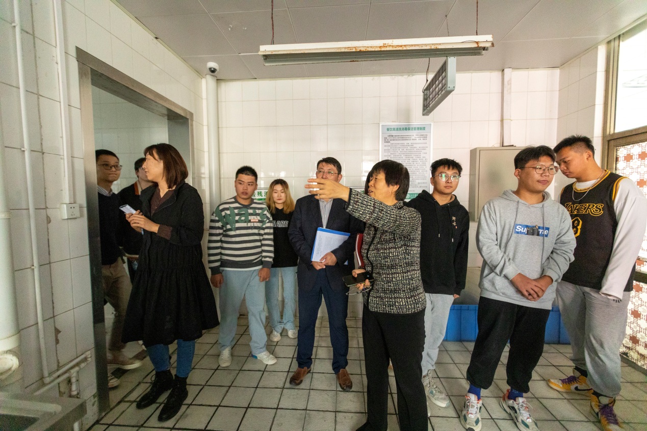 会后,在餐厅责任人的带领下,与会领导、师生代表集体深入学校南北苑餐厅,对餐余垃圾回收处、餐厅后厨、洗碗间、食品储藏间进行了实地调研。