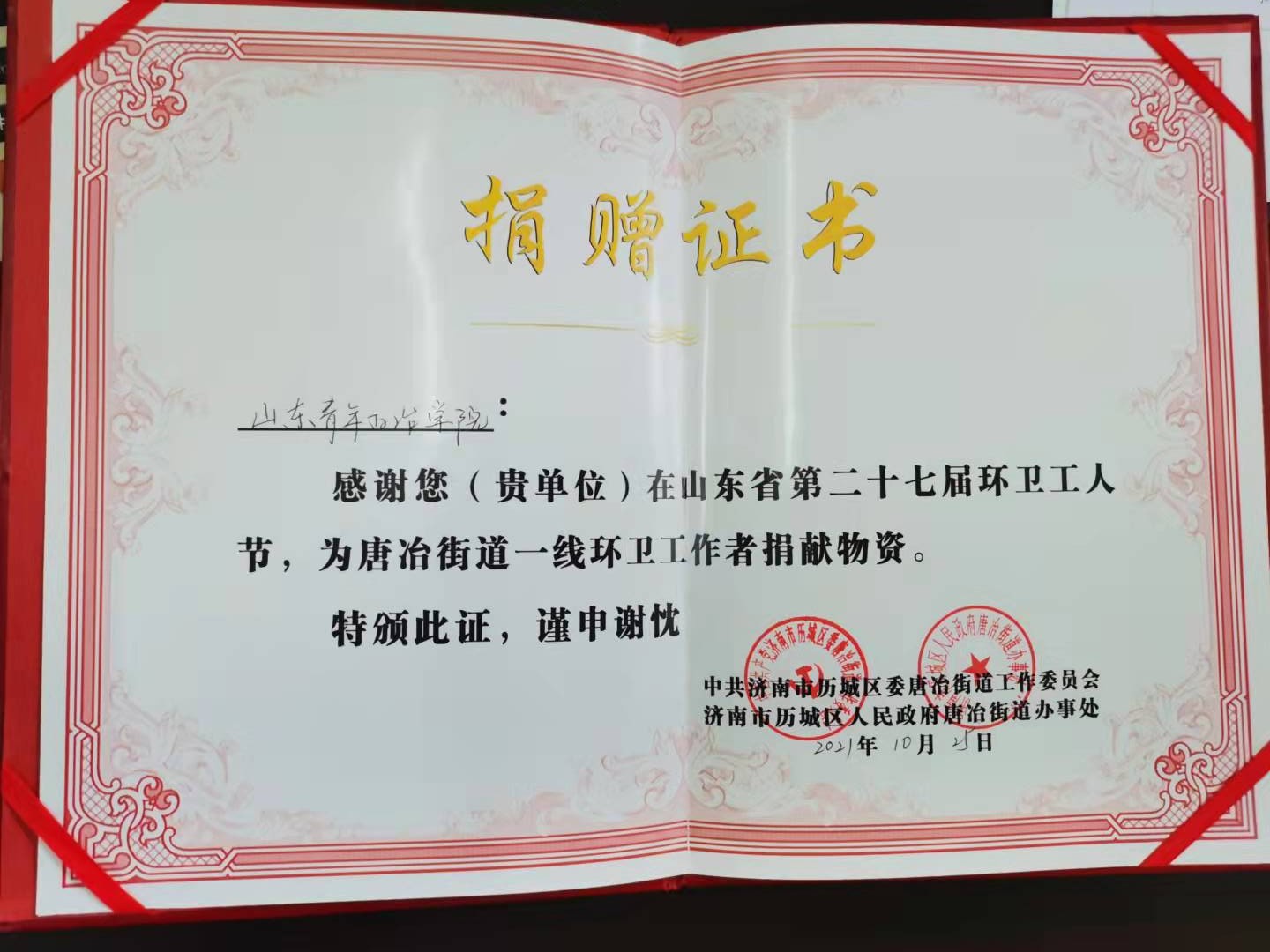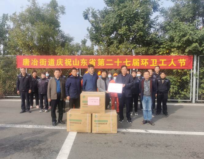 10月25日,唐冶街道举行“庆祝山东省第二十七届环卫工人节”活动。在街道政协联络室的协调下,我校党委委员、副院长李玉英带队,后勤管理处副处长李辉来,物业管理中心主任李瑞成,银丰·青苑物业公司一行五人来到活动现场为唐冶一线环卫工作者捐赠物资,向奋战在一线的环卫工作者致以崇高的敬意和节日的问候。