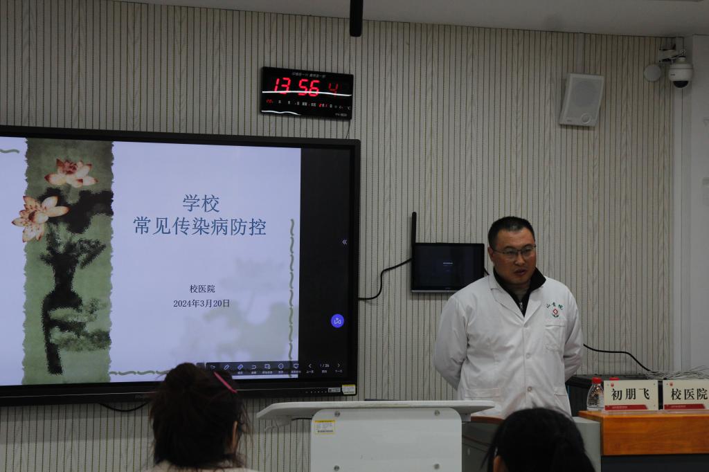 校医院主治医师初朋飞、贺炜以“学校常见传染病防控”为题,向同学们普及了校园内常见传染病(结核、水痘、诺如病毒等)的相关知识,倡导多病共防,有效遏制传染病流行。讲座中详细介绍了结核病的传播途径和预防措施,呼吁同学们积极参与结核病防治活动,在出现结核疑似症状或被确诊肺结核后要立即向学校报告,做到不隐瞒病情、不带病上课,养成勤开窗通风、保证充足睡眠、合理膳食、加强体育锻炼的良好习惯,提高预防疾病的能力。