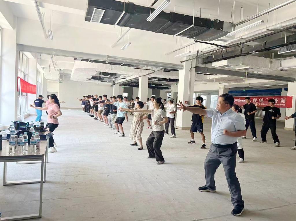 为弘扬中华优秀传统文化,进一步提高师生身体素质,促进师生身心健康发展,5月30日下午,后勤管理处联合体育学院共同开展了“八段锦”健身气功培训活动。济南市疾控中心应急办主任张鑫、历城区疾控中心副主任孙增勇带领“八段锦”培训团队一行10人到我校进行了培训推广。本次培训由副主任中医师、非遗洪式太极拳传承人 、国家级体育指导员王旭峰亲临指导。