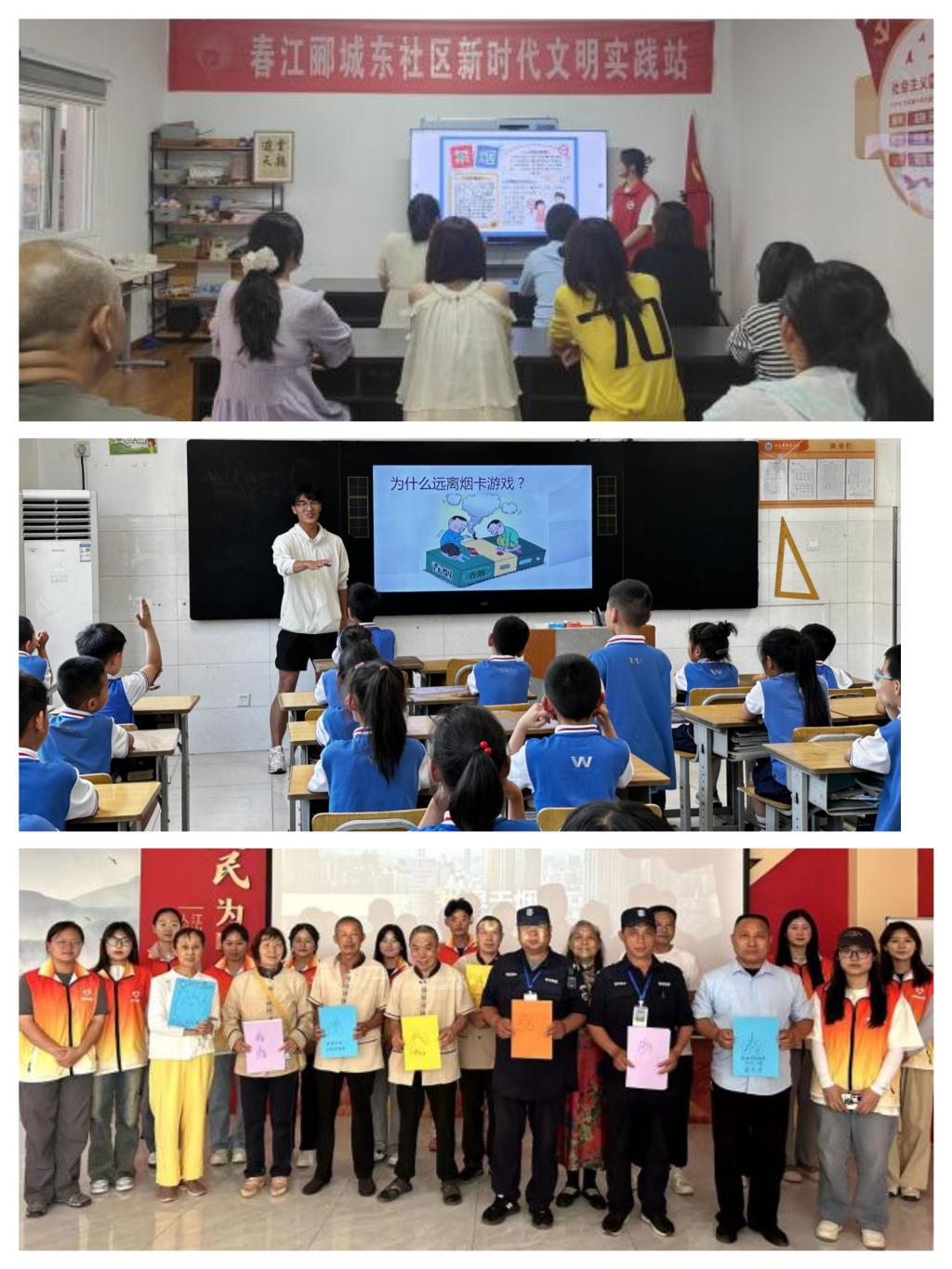 校社联动,强化“无烟”实践。5月29日—31日,各学院团总支依托“百万大学生进社区”组织学生深入驻地社区、学校开展禁烟控烟实践活动。政治与公共管理学院学生会骨干、现代服务管理学院青爱晚养老协会分别走进帝华鸿府、春江郦城等社区普及控烟知识、倡导健康生活,鼓励社区居民从自身做起、从当下开始,携手打造绿色家园;体育学院团支部走进明睿小学开展“拒绝烟卡,拥抱健康”主题活动,通过生动案例讲解,向小学生详细介绍了烟卡对身心健康的潜在危害,引导孩子们自觉做到不收集、不攀比、不玩耍烟卡,现场对小学生课间健康体育游戏进行专业示范和细致指导。