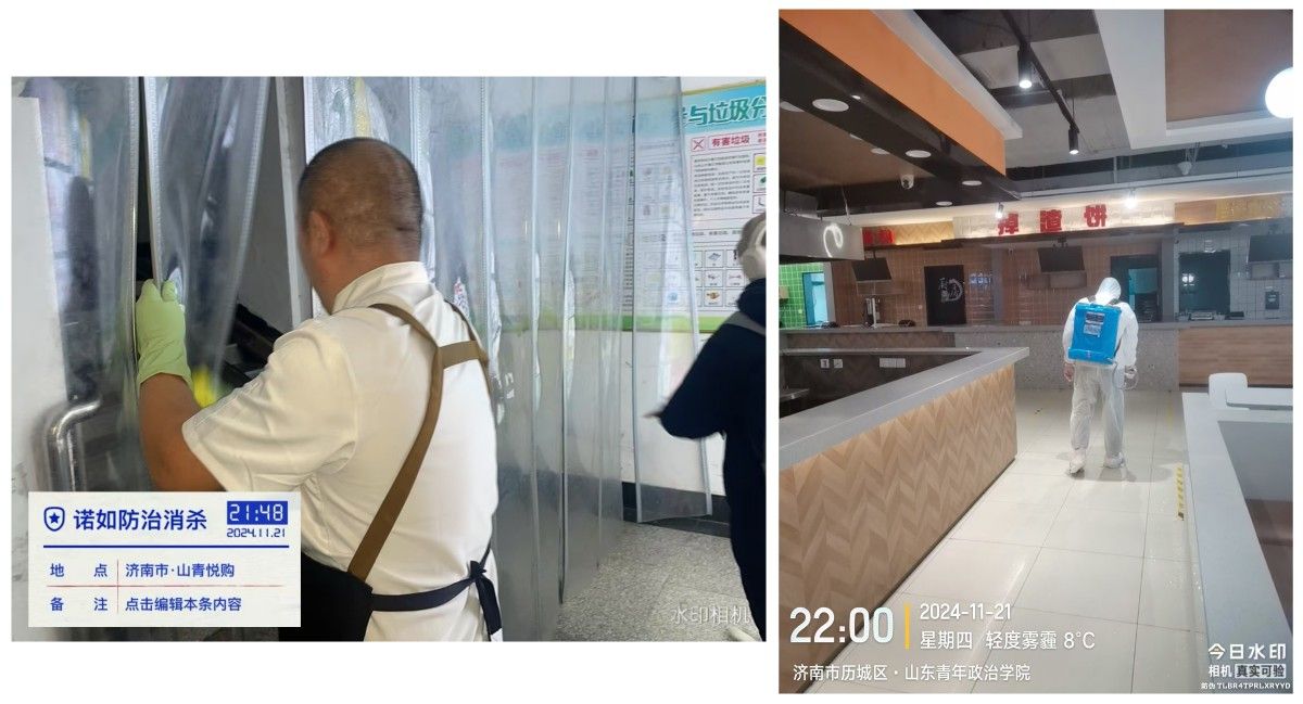 为了做好学校餐厅饮食安全工作,有效抑制各类病毒、细菌等病原体、虫媒的滋生,预防和控制传染病在校园内的预防传播和流行。2024年11月21日至24日,后勤管理处饮食服务中心对我校经营场所开展了集中消杀工作。