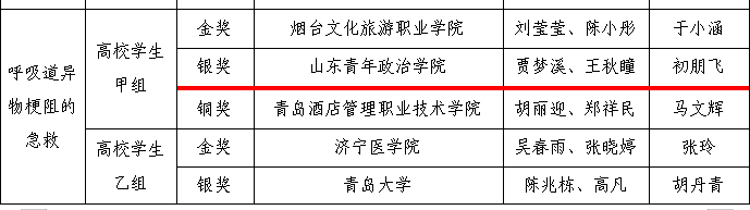 11月14日-16日,2024年山东省学校急救技能大赛在青岛举行,现代服务管理学院2023级健康服务与管理专业1班贾梦溪、王秋瞳两位同学组成的代表队,在后勤管理处医师初朋飞的指导下,经过激烈角逐,荣获高校学生甲组团队二等奖、呼吸道异物梗阻的急救单项银奖。