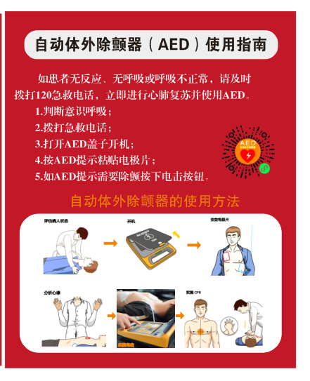 为帮助师生熟悉急救设备的设置位置及正确使用方法,校医院在学生公寓、餐厅、图书馆、运动场等公共区域明显位置张贴自动体外除颤仪(AED)使用指南,师生看图就可直接获得AED的正确使用方法,同时微信扫一扫二维码即可定位并按导航指引获取最近的AED。