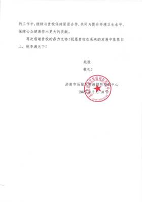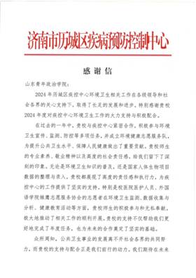 近日,历城区疾病预防控制中心向我校发来感谢信,对学校在校园及区域疾病防控工作中的卓越表现表达诚挚谢意。